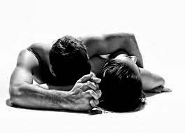 A Dimly lit room, two bodies entwined and slick with sweat;